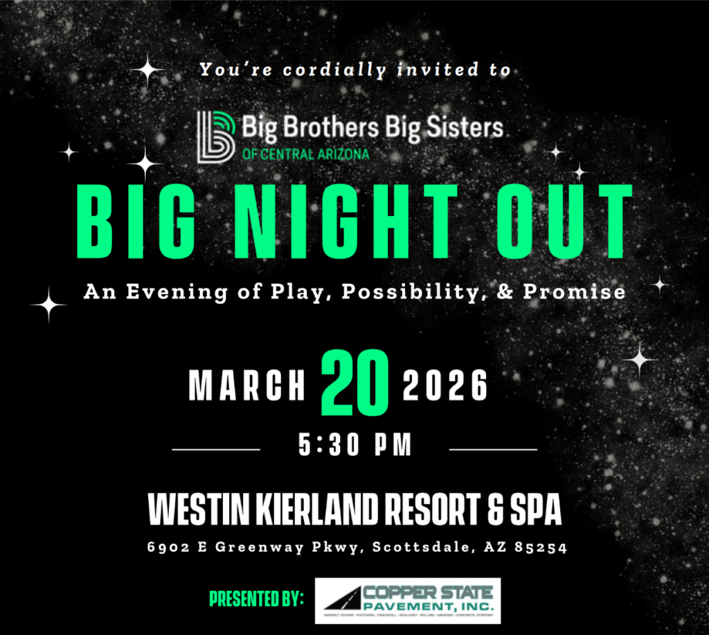 Rediscover the joy of childhood and play at the Big Night Out Gala – An Evening of Play, Possibility, and Promise - benefiting Big Brothers Big Sisters of Central Arizona (BBBSAZ) and presented by Copper State Pavement. This fun-filled evening will blend a sophisticated style with the imagination and wonder of childhood, creating an unforgettable experience for all who attend. Join us as we celebrate and share powerful stories highlighting the life-changing impact Big Brothers Big Sisters of Central Arizona has on youth throughout our community.